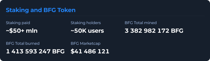 Don’t forget that we have an active Farming page with current APR up to 91%! Over 64 million BFG are staked there. This allows us to say that we are developing not only as a gaming platform, but also as a crypto product. We plan to cooperate with other projects in this direction. Stay tuned!