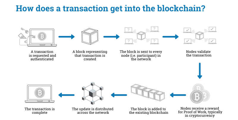 - Closing the deal: The block is added to the blockchain and anyone with a copy of it (every computer on the network) will get an updated version with the new block.