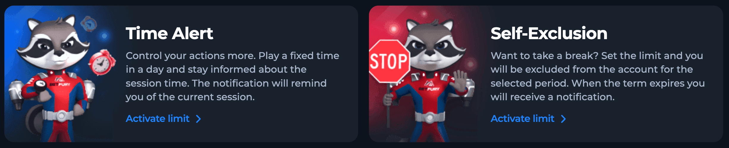 - Responsible Gambling: play while you feel the spirit of victory, don’t chase defeats, and take breaks for relaxation. Use the Responsible Gambling features – set limits or specify a time period for self-exclusion from the account.