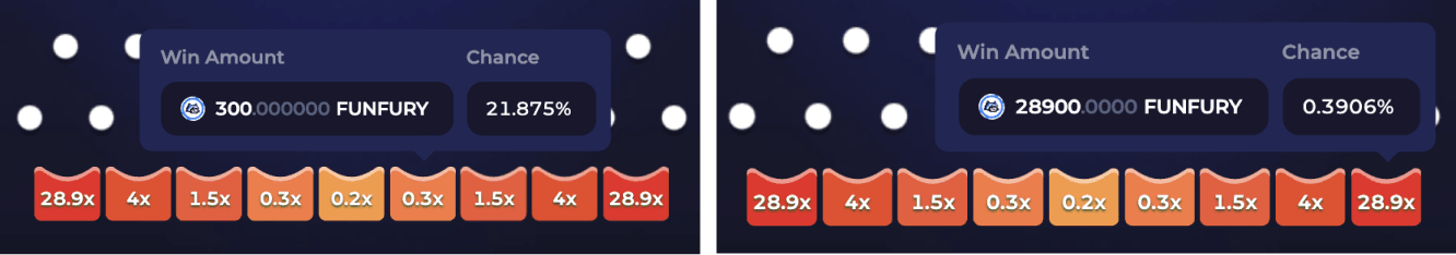 It directly affects the multipliers and the probability of winning. The online Plinko model is similar to Pascal's triangle – a table of mathematical coefficients. It reflects that the center is where most winning paths are concentrated. For High Risk and 8 Rows, the ball is 56 times more likely to hit 0.3x than 28.9x. For Low Risk, the same difference works for 1x and 5.6x.
