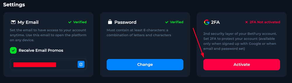 You should activate 2FA before making any withdrawals on BetFury. It’s your shield against hacks, phishing, and account takeovers.